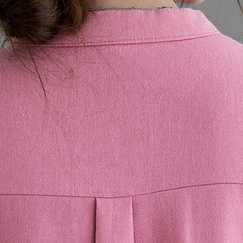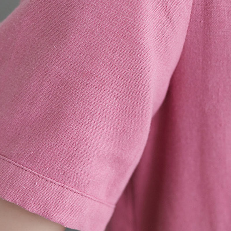 Buddha Stones Casual Daily Pure Color Button Design Short Sleeve Cotton Linen Midi Dress With Pockets