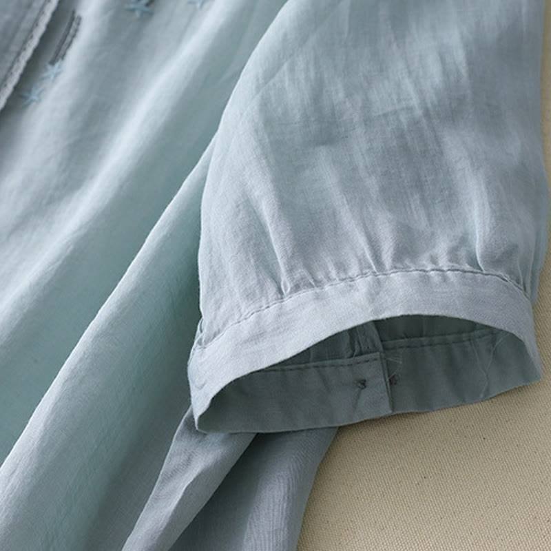 Buddha Stones Casual Shooting Star Embroidery V-Neck Half Sleeve Cotton Linen Women's Shirt