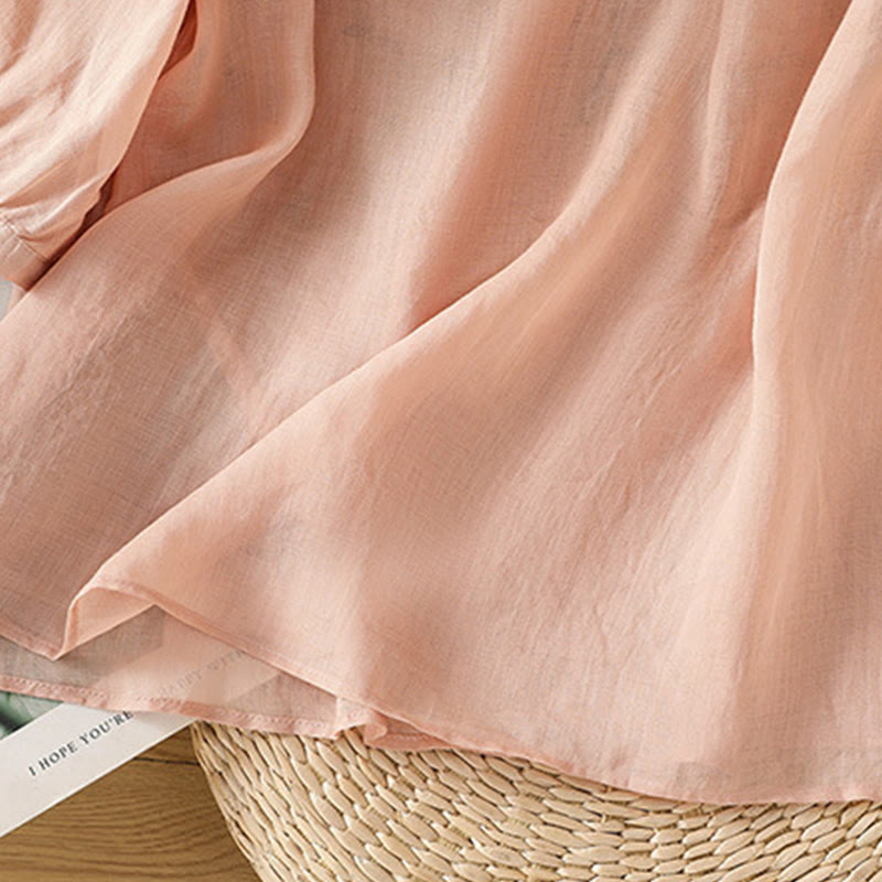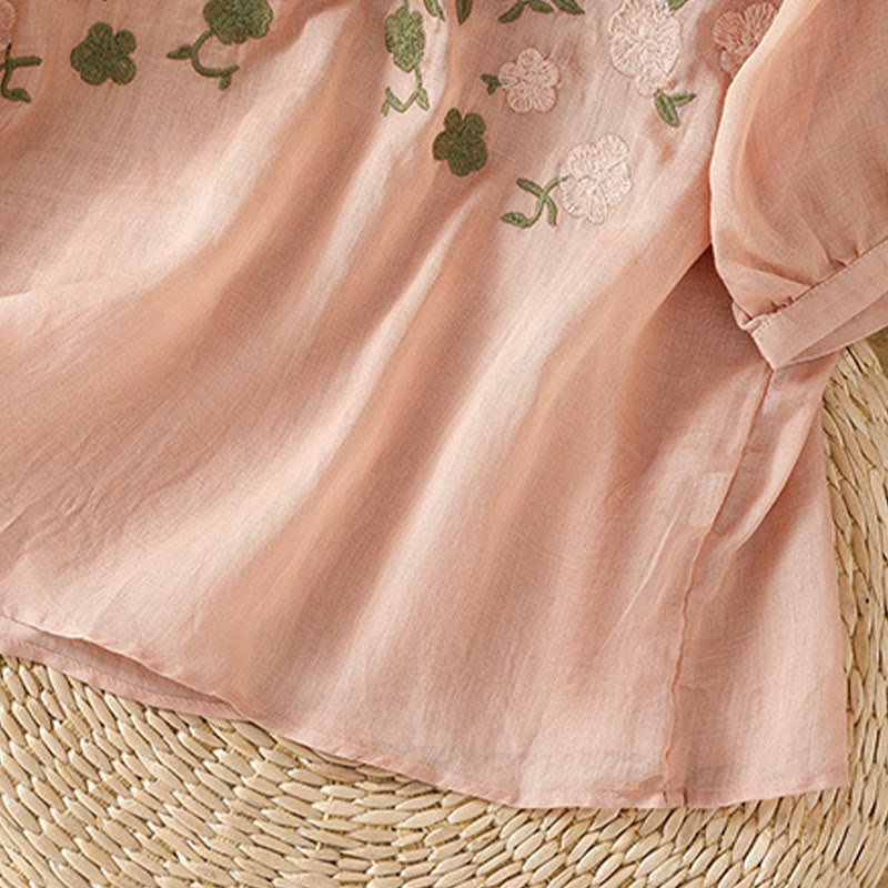 Buddha Stones Casual Women's Flowers Green Leaves Embroidery Pattern V-Neck Design Half Sleeve Cotton Linen Shirt - Pink - US8-10,UK/AU12-14,EU40-42 (2XL) - image 0
