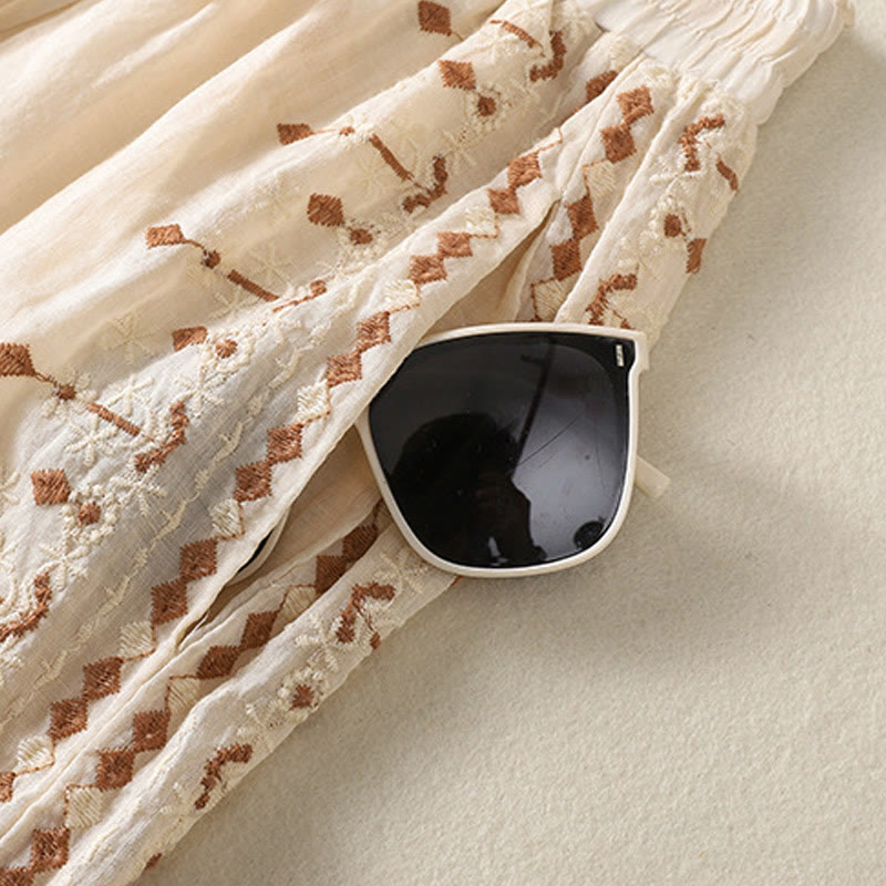 Buddha Stones Ethnic Embroidery Drawstring Cotton Linen Women's High Waist Wide Leg Pants With Pockets
