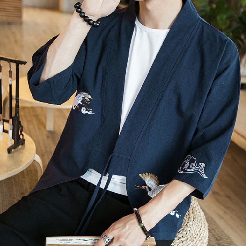 Buddha Stones Embroidery Open Front Jacket Cotton Linen Men's Three Quarter Sleeve Kimono - Navy - US/UK/AU46,EU56 (5XL) - image 0