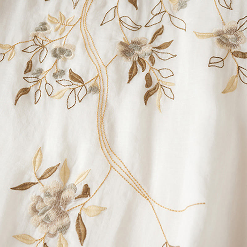 Buddha Stones Embroidered Leaf Crew Neck Half Sleeve Cotton Fiber Midi Dress - Khaki - US8-10,UK/AU12-14,EU40-42 (2XL) - image 0