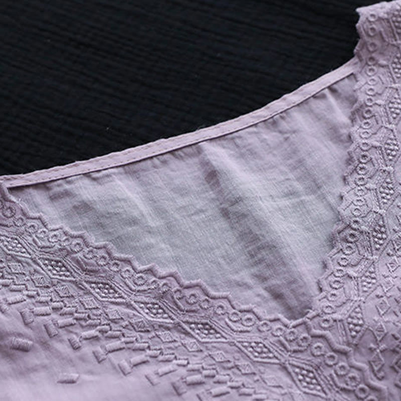 Buddha Stones Summer Casual Embroidered Pattern Women's V-Neck Design Half Sleeve Cotton Linen T-shirt