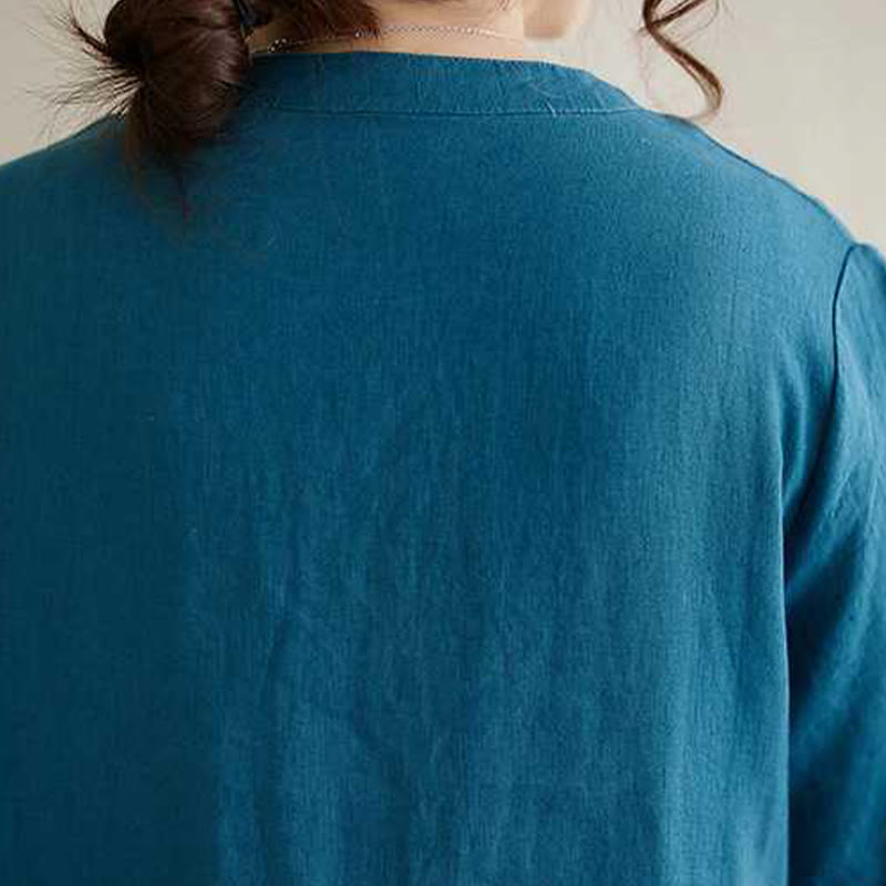 Buddha Stones Stand Collar Buttons Design Linen Short Sleeve Midi Dress With Pockets - image 23