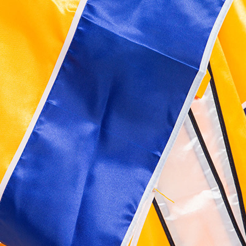 • Vibrant Color & Symbolic Embroidery: The bright fabric is paired with blue trim and embroidered auspicious patterns, symbolizing protection, blessings, and spiritual harmony.