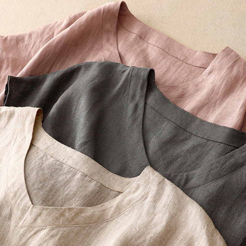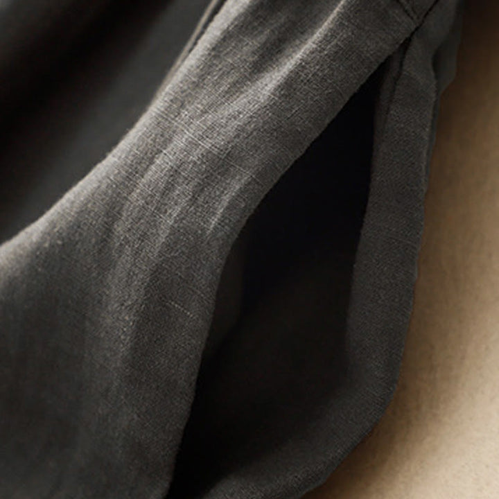 Buddha Stones Casual Artistic Solid Color Simple Design High Waist Short Sleeve Cotton Linen Midi Dress With Pockets