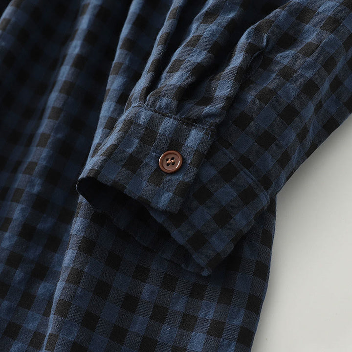 Buddha Stones Retro Contrasting Color Plaid Puff Long Sleeve Cotton Linen Midi Dress With Pockets - DarkBlue - US8-10,UK/AU12-14,EU40-42 (2XL) - image 0