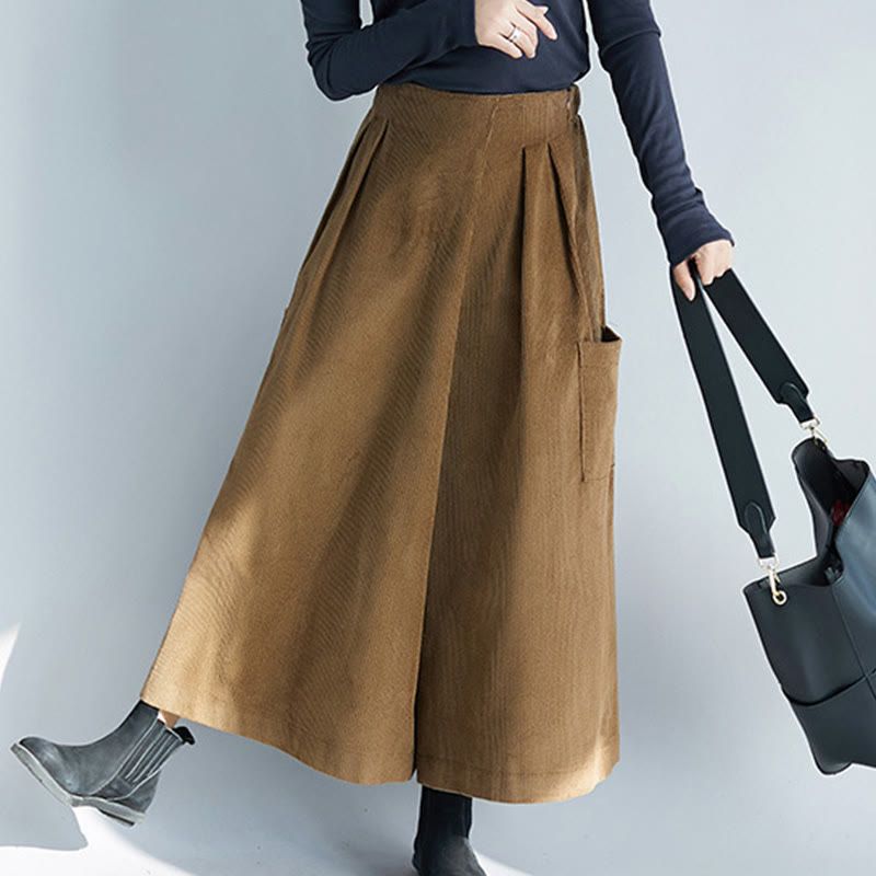 Buddha Stones Women's Plain Side Zipper Design Wide Leg Corduroy 7-8 Length Pants With Pockets