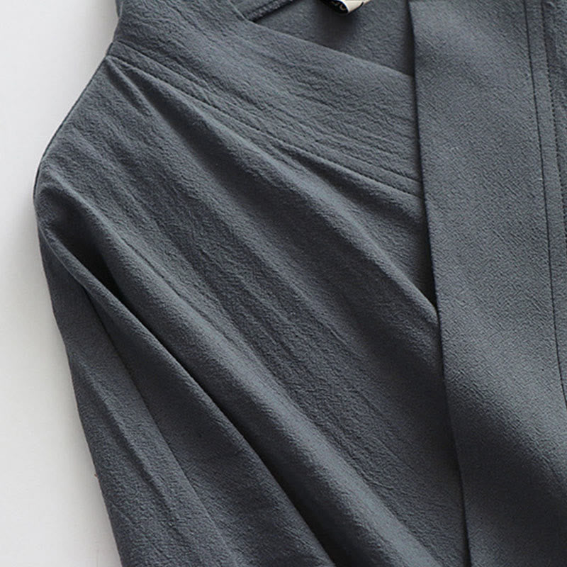 - Classic Overlapping Front: Features a minimalist closure and wide sleeves.
