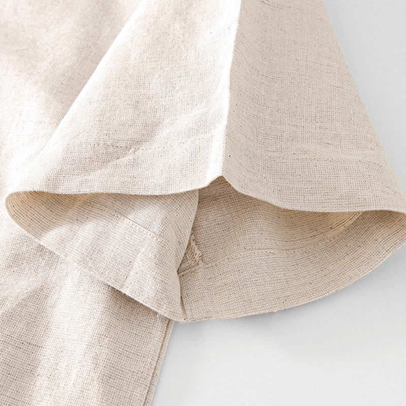 Buddha Stones Soft Plain Frog-button Crew Neck Cotton Linen Half Button Men's Shirt