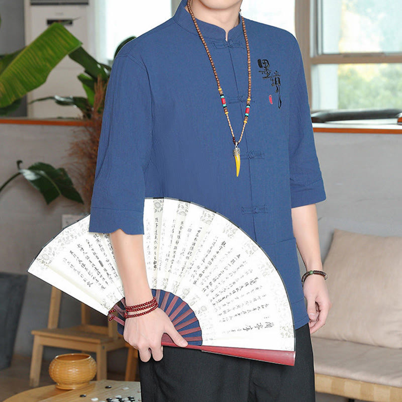 Buddha Stones Frog-Button Chinese Tang Suit Three Quarter Sleeve Cotton Linen Men's Shirt