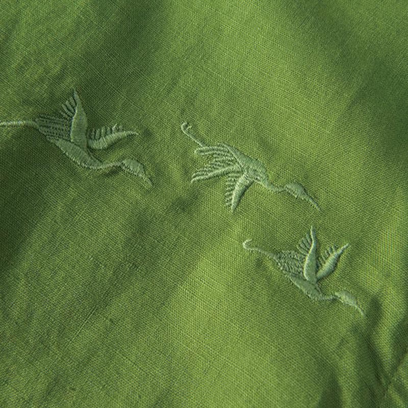 Buddha Stones Soft Embroidery Crane Pattern Stand Collar Cotton Linen Half Button Men's Shirt
