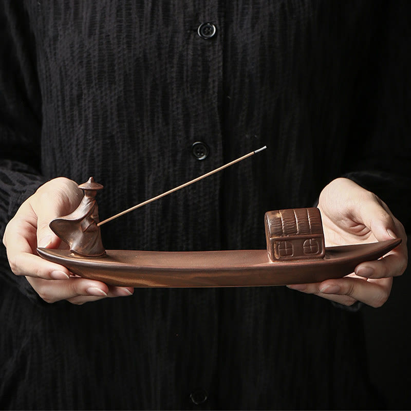 Buddha Stones Fisherman Fishing Boat Bamboo Buddha Hand Lotus Spiritual Healing Ceramic Stick Incense Burner Decoration - Fisherman 25.8*5*7.5cm - image 0