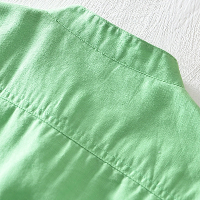 Buddha Stones Solid Color Half Button Design Stand Collar Men's Short Sleeve Cotton Linen Shirt