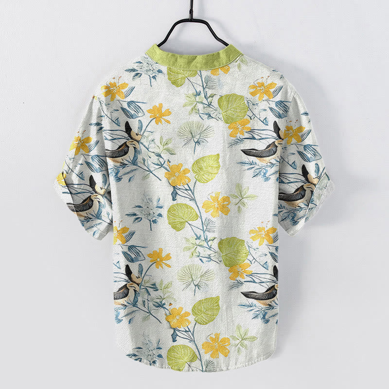 - Design: Tropical floral and bird motifs convey a relaxed, vacation-ready aesthetic. All-over print emphasizes nature-inspired imagery and vintage Hawaiian styling. Contrasting collar trim and linen-like breathable fabric enhance visual focus and casual comfort.