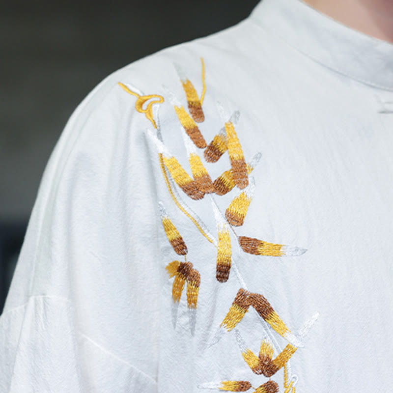 Buddha Stones Embroidery Men's Chinese Frog-Button Three Quarter Sleeve Shirt Clothing