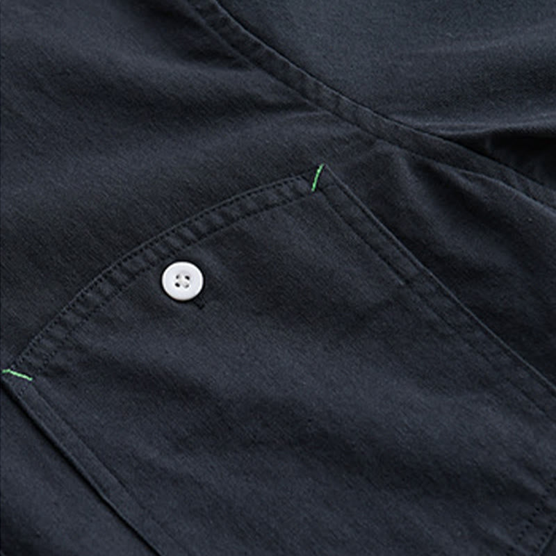Buddha Stones Solid Buttons Down Decorative Pocket Men's Stand Collar Long Sleeve Cotton Shirt