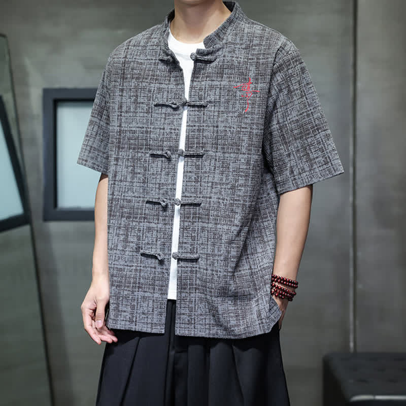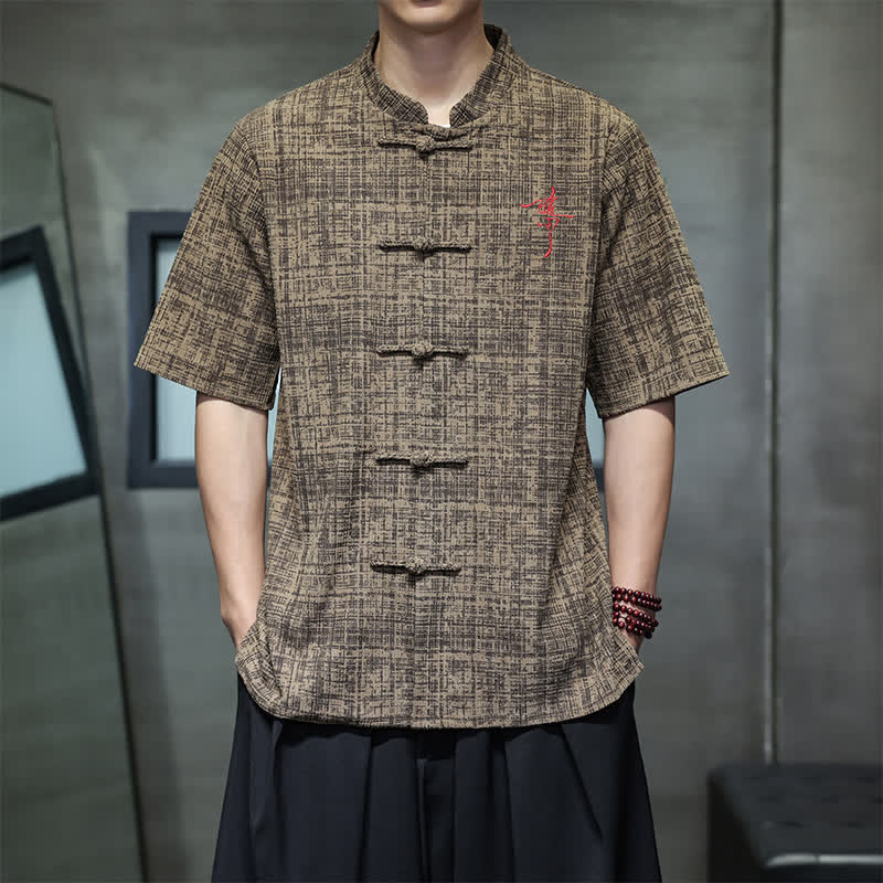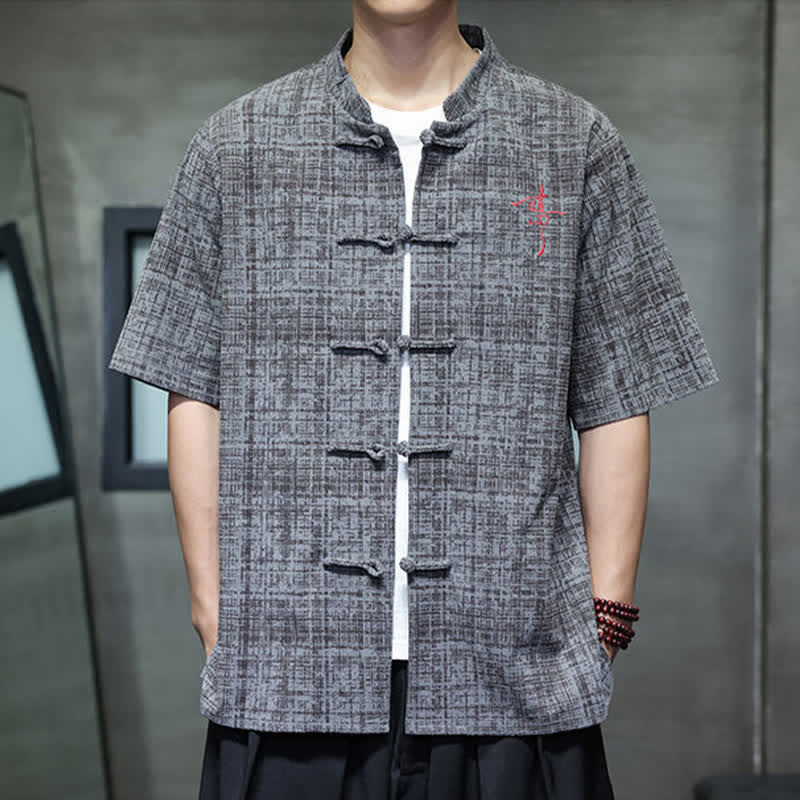 Buddha Stones Summer Casual Mandarin Collar Frog Button Solid Men's Short Sleeve Shirt