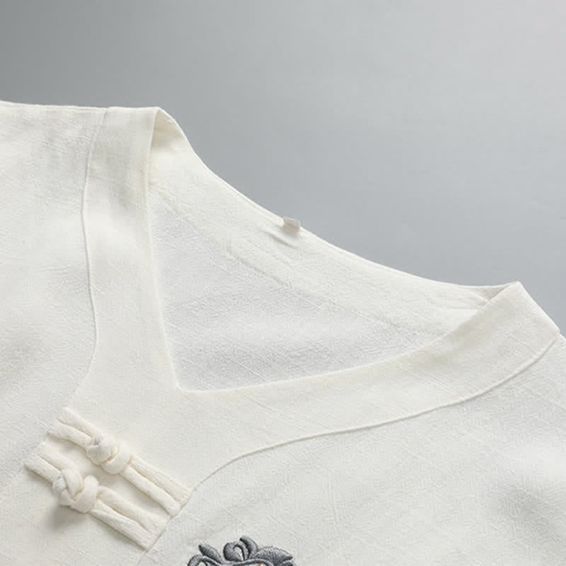 Buddha Stones Summer Solid Frog Button V-neck Auspicious Cloud Embroidery Cotton Linen Men's Short Sleeve Shirt
