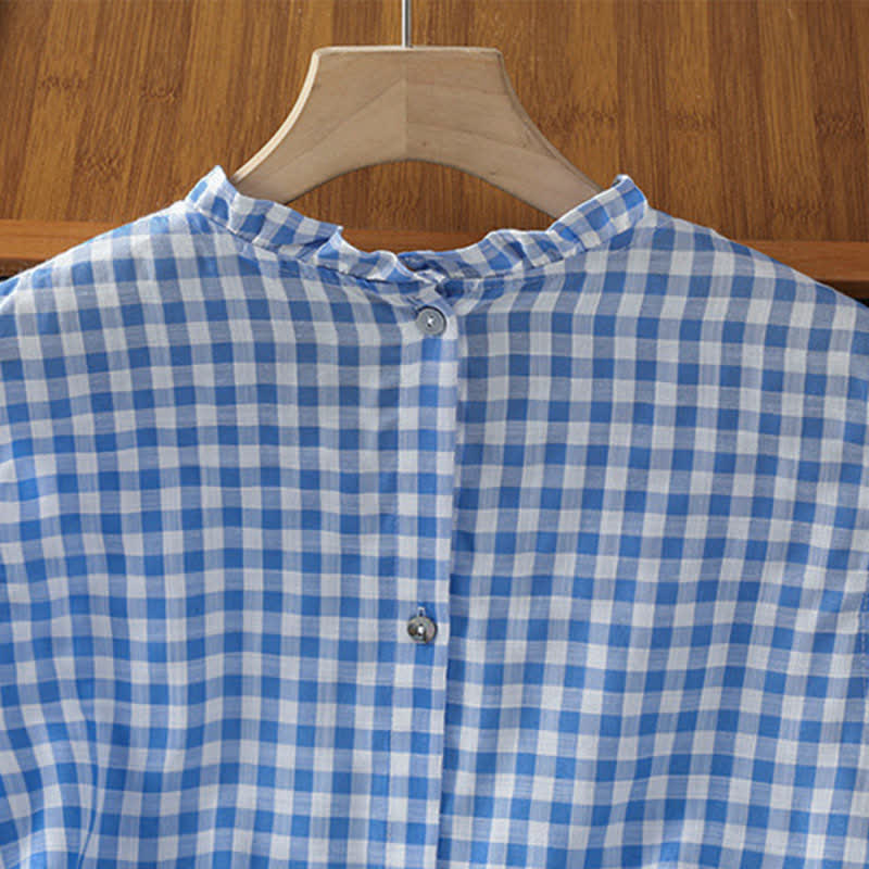 Buddha Stones Summer Plaid Ruffled Crew Neck Back Button Design Women's Sleeveless T-Shirt - image 6