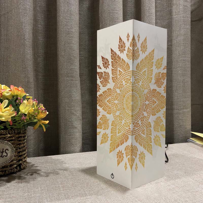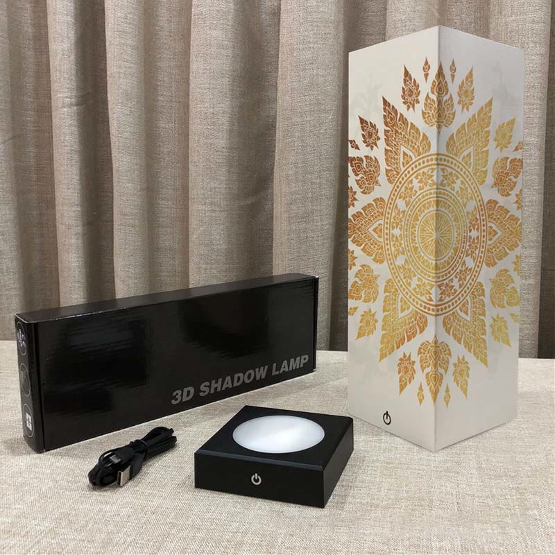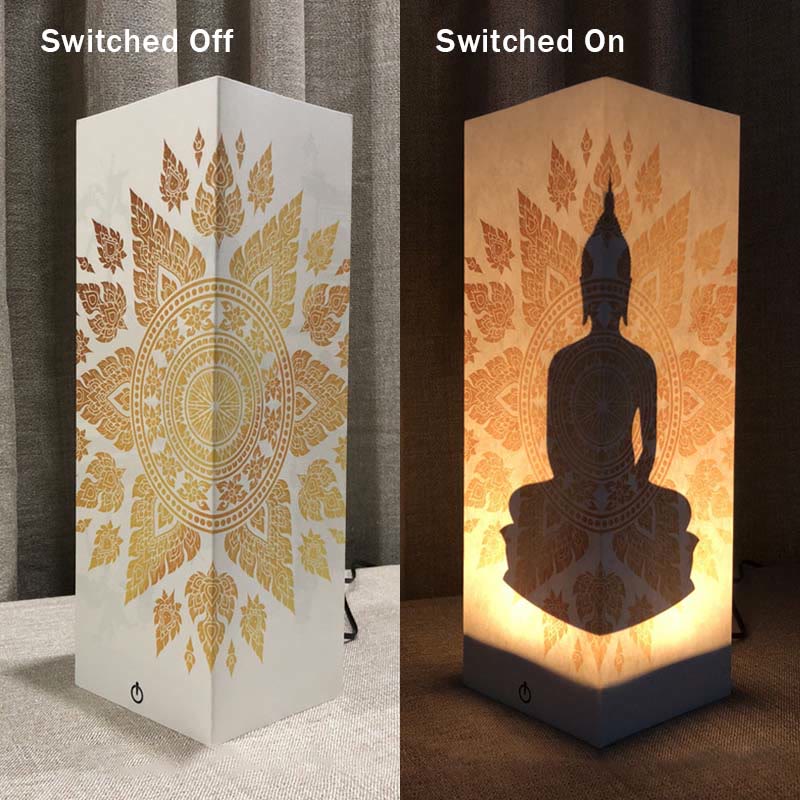 - This warm white glowing Buddha Shadow lamp looks great anywhere you place it. When not lit, the paper lamp cover has an attractive mandala motif which also shows up as a contrasting background image to the Buddha statue which miraculously 'appears' when the lamp is switched on.