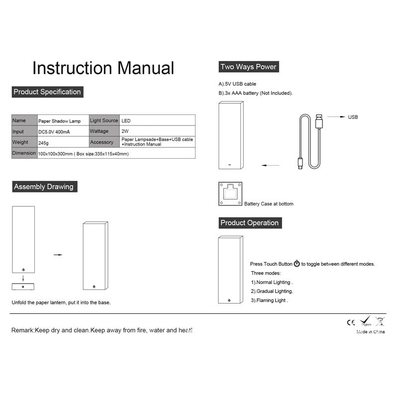 - Package Included: Paper lamp cover *1, Base *1, USB cable *1, Buffer sponge *1, Manual *1, Box *1