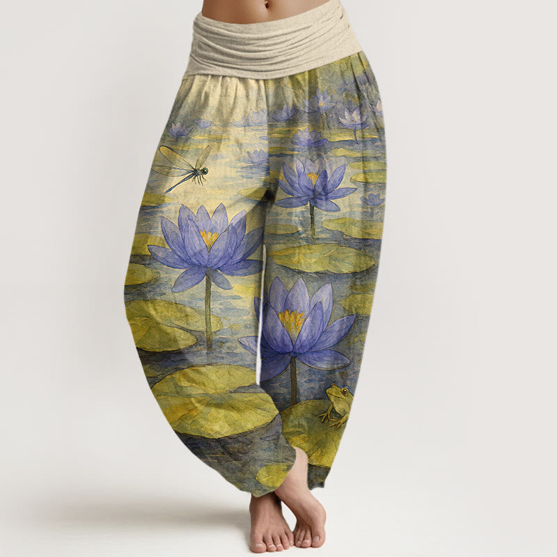 - Design: These harem pants are inspired by lotus flowers, lotus leaves, dragonfly, and frog. The lotus symbolizes purity and elegance, while the dragonflies and frogs add vitality and energy, embodying the beauty of nature. The design style is reminiscent of watercolor painting, with soft brushstrokes and delicate colors, possessing a fresh, elegant, and natural quality that evokes a sense of tranquility and comfort.