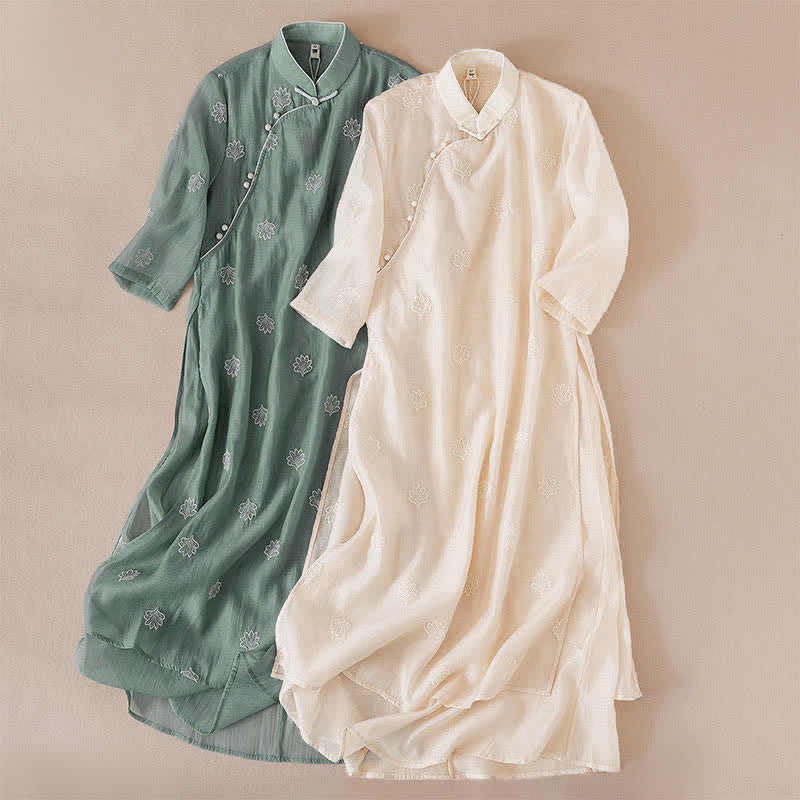 Buddha Stones Embroidery Flower Frog-Button Stand Collar Side Slit Half Sleeve Maxi Dress