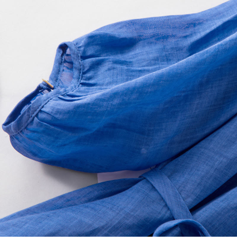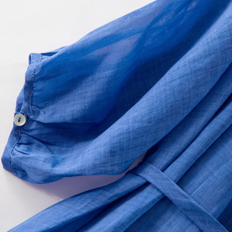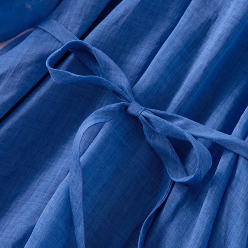 Buddha Stones Plain Drawstring Three Quarter Puff Sleeve Cotton Linen Midi Dress With Pockets