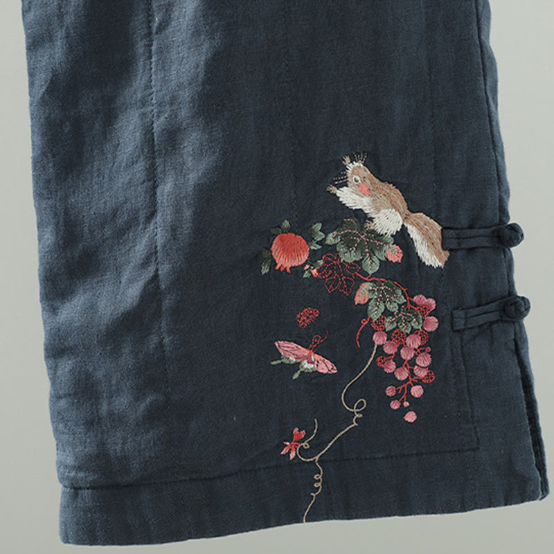 Buddha Stones Embroidered Frog Button Cotton Padded Women's Wide Leg Pants With Pockets
