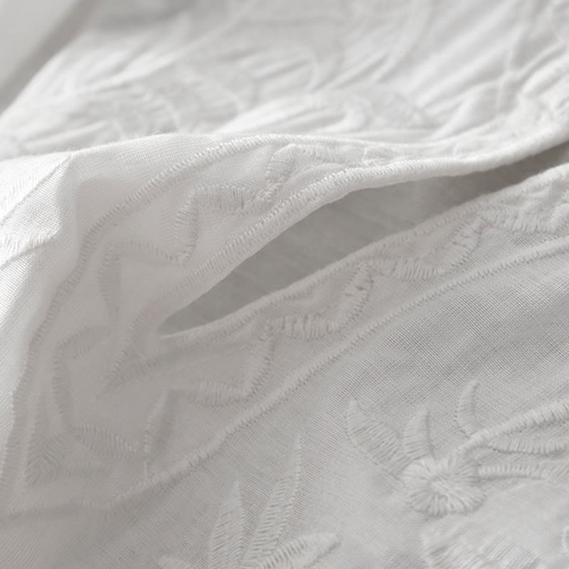 Buddha Stones Summer White Pure Color Embroidery Leaf Flower V-Neck Short Sleeve Midi Dress With Pockets - image 10