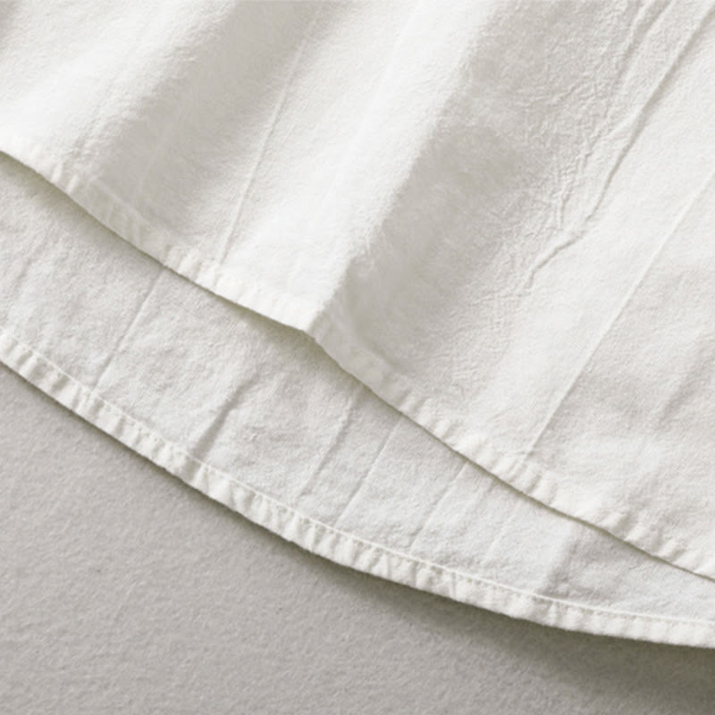 Buddha Stones Plain Pleats Half Buttons Design Stand Collar Men's Long Sleeve Cotton Linen Shirt