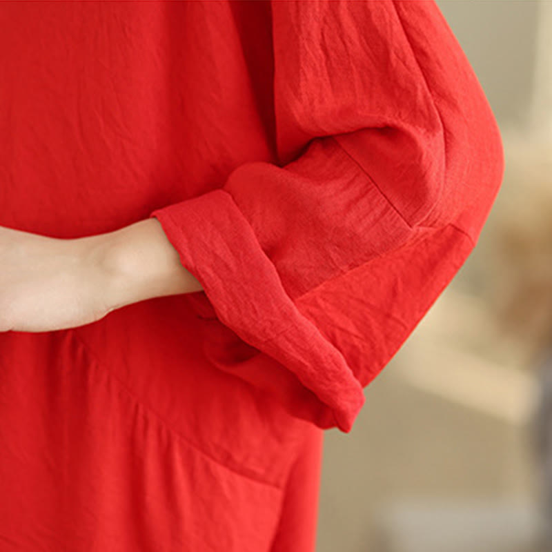 Buddha Stones Fall Pure Color V-Neck Long Sleeve Cotton Midi Dress - Red - US4-12,UK/AU8-18,EU36-46(F) - image 8