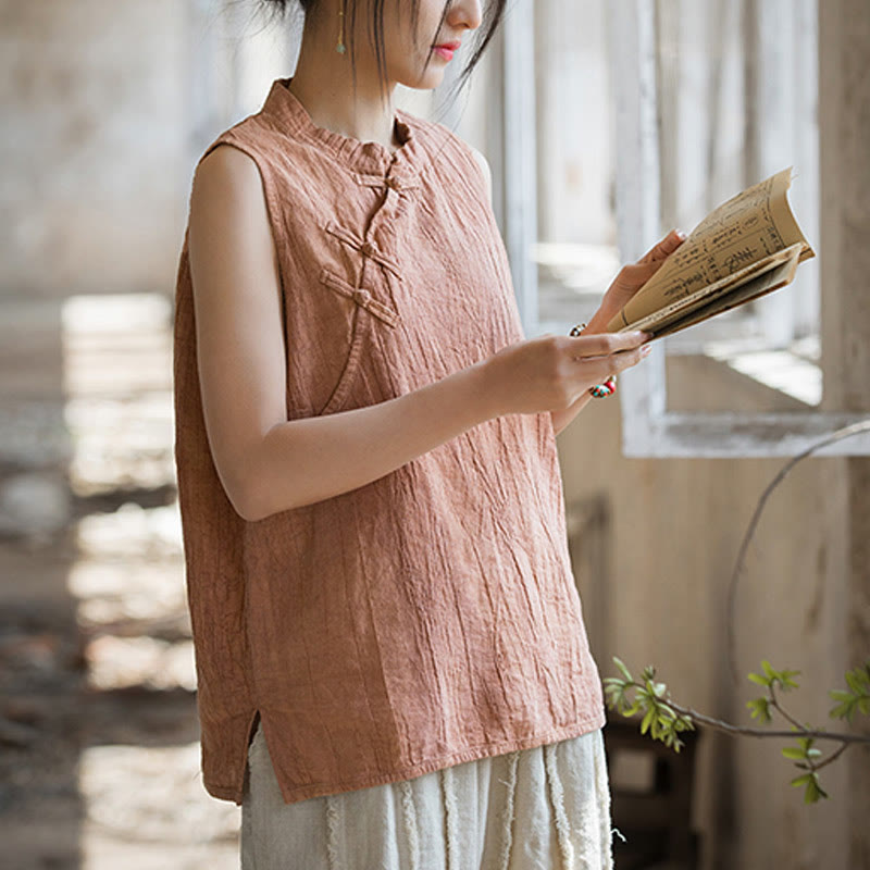 Buddha Stones Summer Tie-dye Frog-Button Ramie Cotton Sleeveless Women's Vest