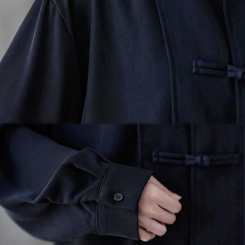 Buddha Stones Black Plain Frog-Button Lapel Women's Cotton Long Sleeve Shirt
