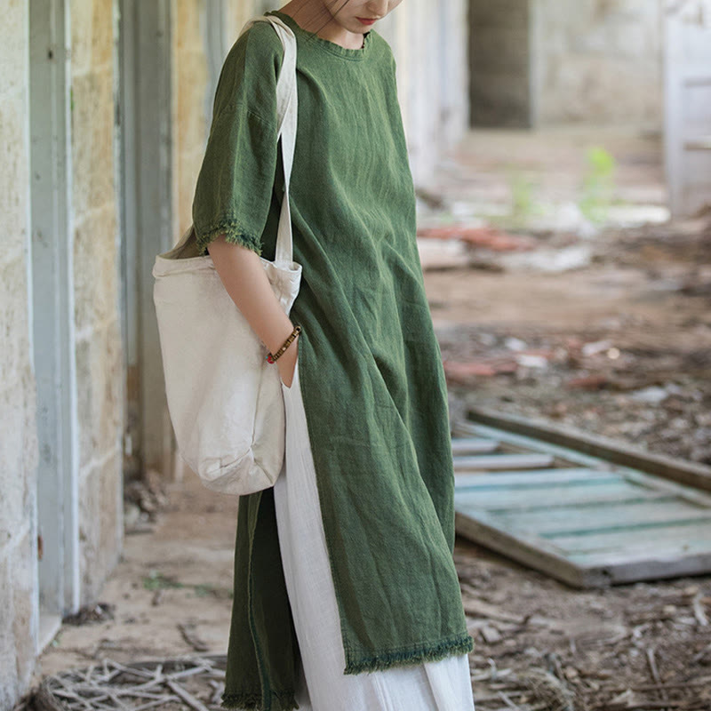 Buddha Stones Mid Length Dress Ramie Linen Half Sleeve Split Hem Top T-Shirt
