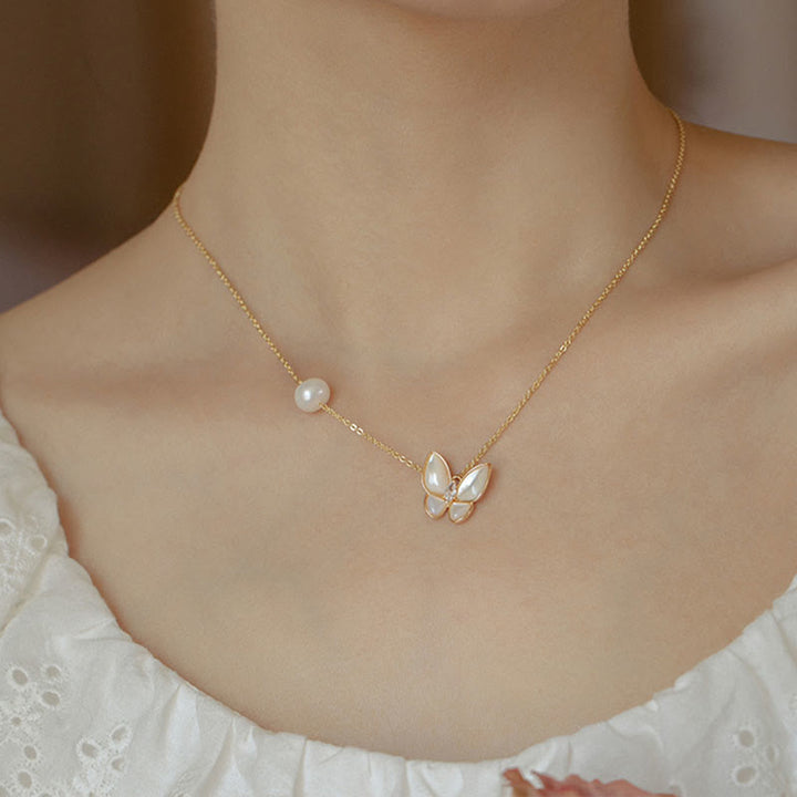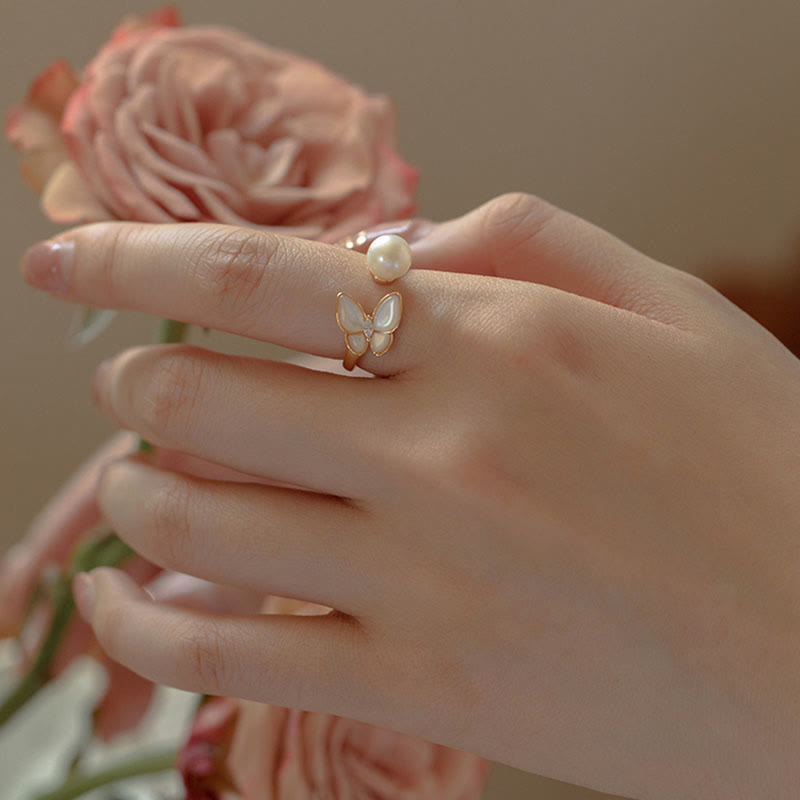 Buddha Stones 14K Gold Plated Copper Pearl Tridacna Stone Butterfly Blessing Ring Bracelet Necklace Pendant Earrings Set