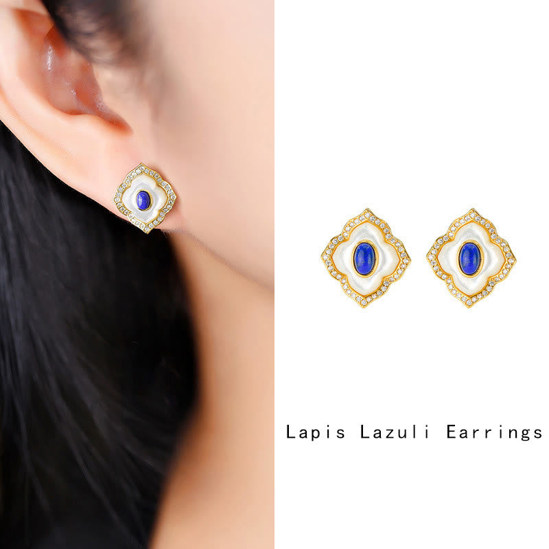 Buddha Stones 925 Sterling Silver Tridacna Stone Lazurite Prismatic Design Blessing Earrings Necklace Pendant Jewelry Set