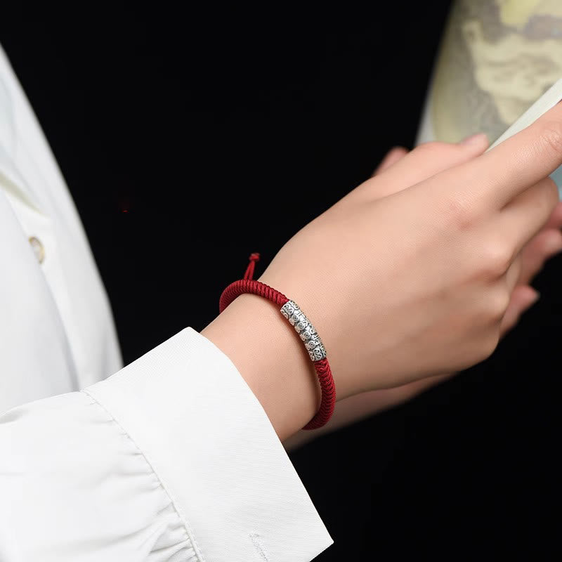 Buddha Stones Handmade 999 Sterling Silver Peace and Good Fortune Om Mani Padme Hum LuckĀ Rope Bracelet - Dark Red(Wrist Circumference 14-20cm) - Peace and Good Fortune - image 0