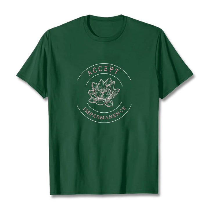 - DESIGN INSPIRATION: This T-Shirt featuring a lotus flower design alongside the phrase "Accept Impermanence" symbolizes the beauty of change and the importance of embracing life's transitory nature. The lotus flower represents purity and spiritual growth, while the message encourages wearers to find peace in the acceptance of life's inevitable changes, promoting mindfulness and resilience.