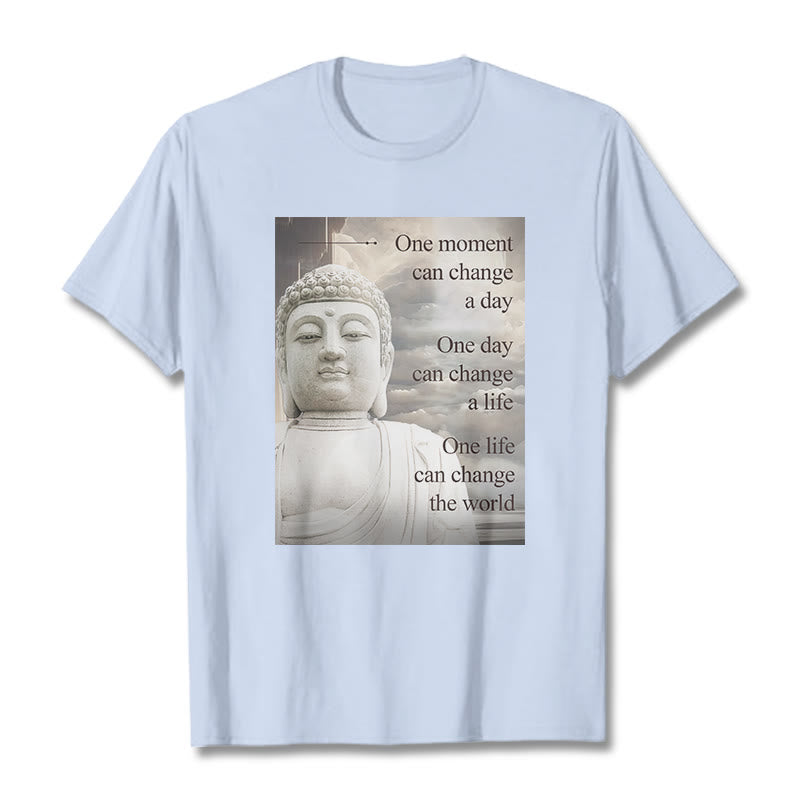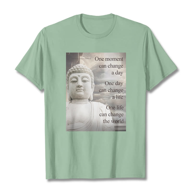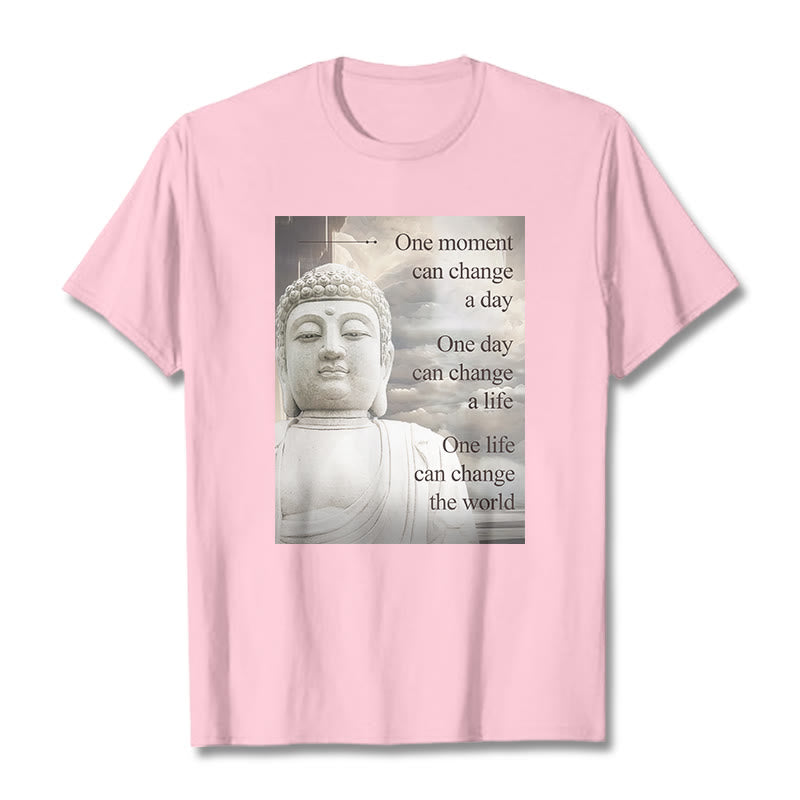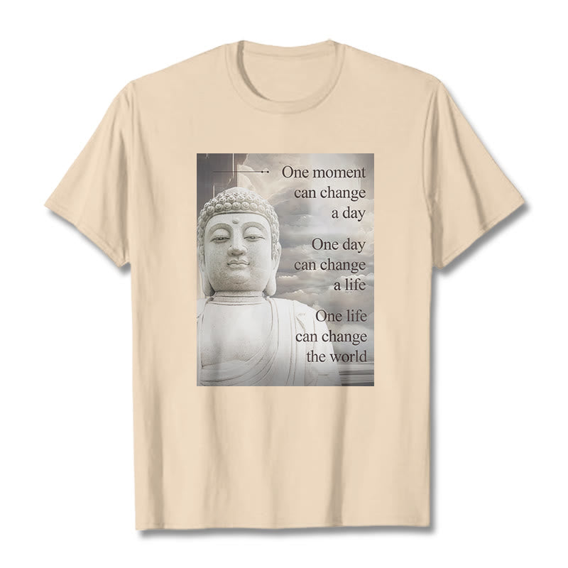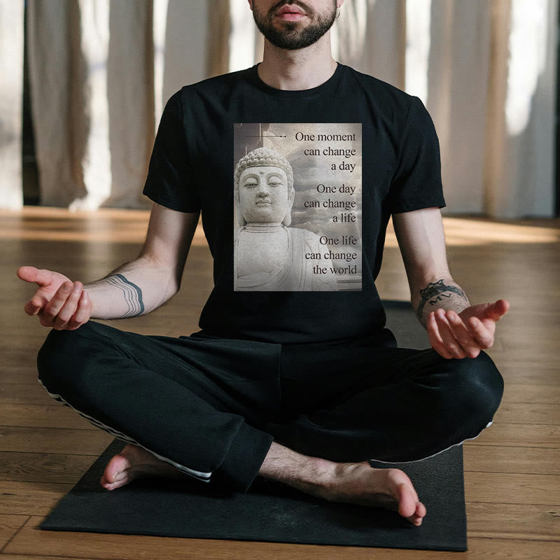 One Moment Can Change A Day T-shirt features an inspiring message with a serene Buddha design, symbolizing the power of mindfulness and positive change. Made from soft, high-quality fabric, this t-shirt encourages a mindful and present lifestyle. Perfect for daily wear, the uplifting graphic serves as a reminder that small moments can have a big impact.