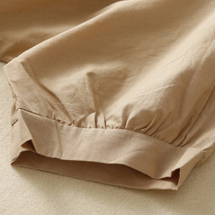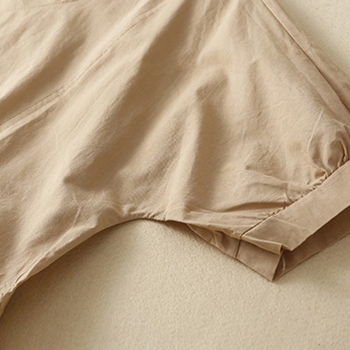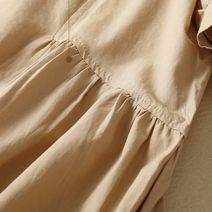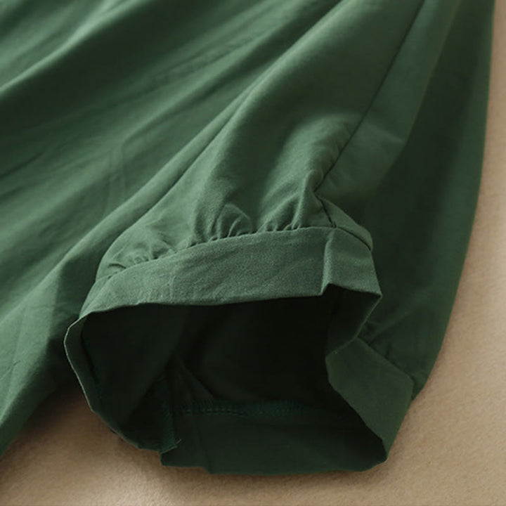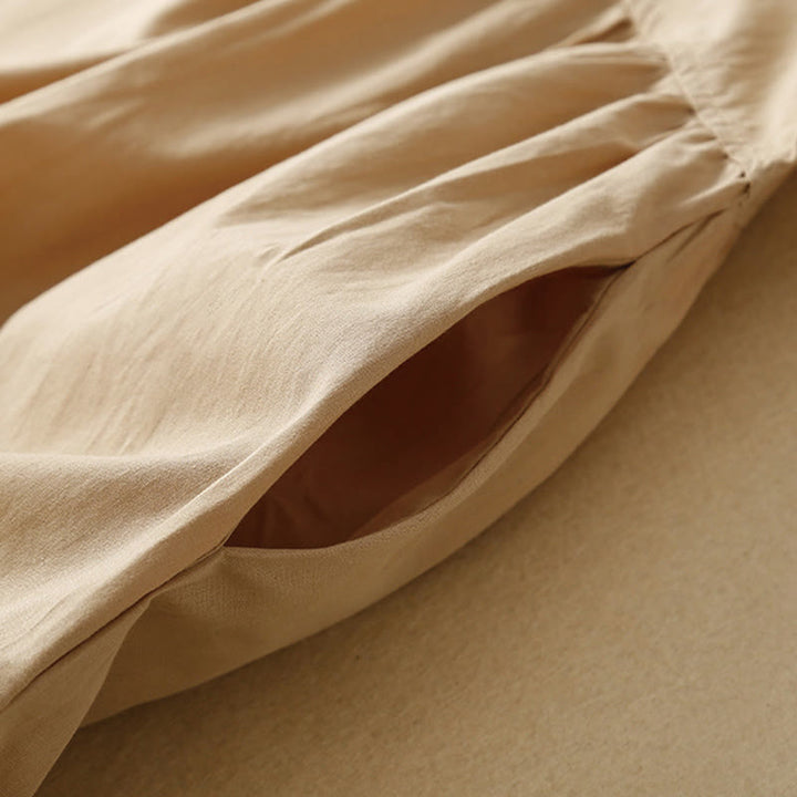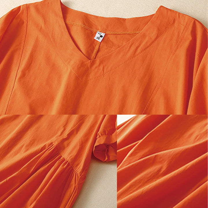 Buddha Stones Casual Pure Color Design Short Sleeve V-Neck Cotton Midi Dress With Pockets