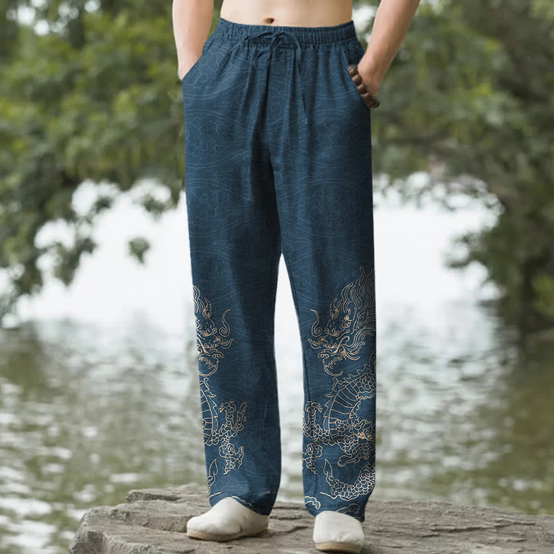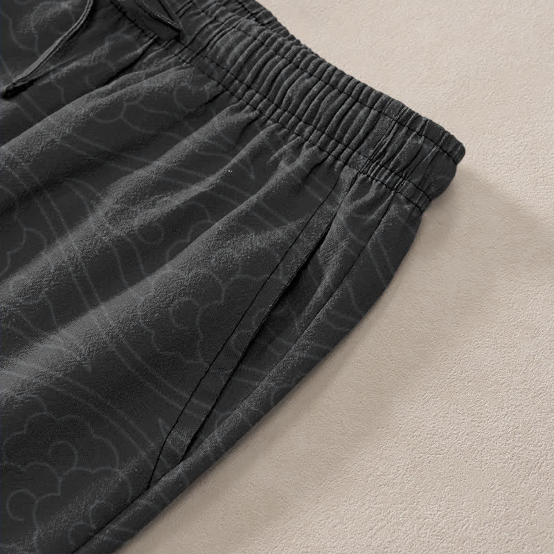 - Design: The design draws on traditional East Asian dragon and cloud motifs, evoking cultural heritage and an oriental aesthetic. The dragon symbolizes strength, protection and good fortune, adding symbolic meaning. Positioned on the lower leg, the colorful pattern creates a handcrafted focal detail that contrasts the dark textured fabric.