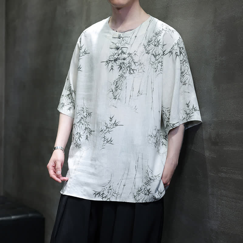 Buddha Stones Summer Tang Style Frog Button Bamboo Print Cotton Linen Men's Short Sleeve Shirt - WhiteSmoke - US/UK/AU46,EU56 (5XL) - image 0