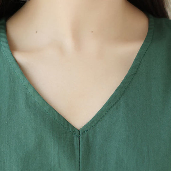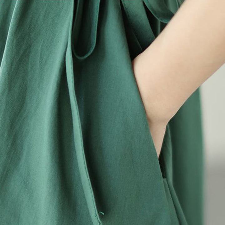 Buddha Stones Pure Color Lace-Up Short Sleeve Cotton Linen Midi Dress With Pockets