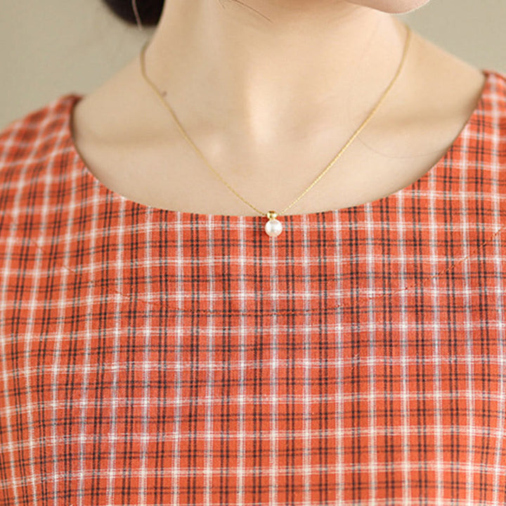 Buddha Stones Commute Plaid Pattern Simple Design Cotton Linen Short Sleeve Midi Dress With Pockets