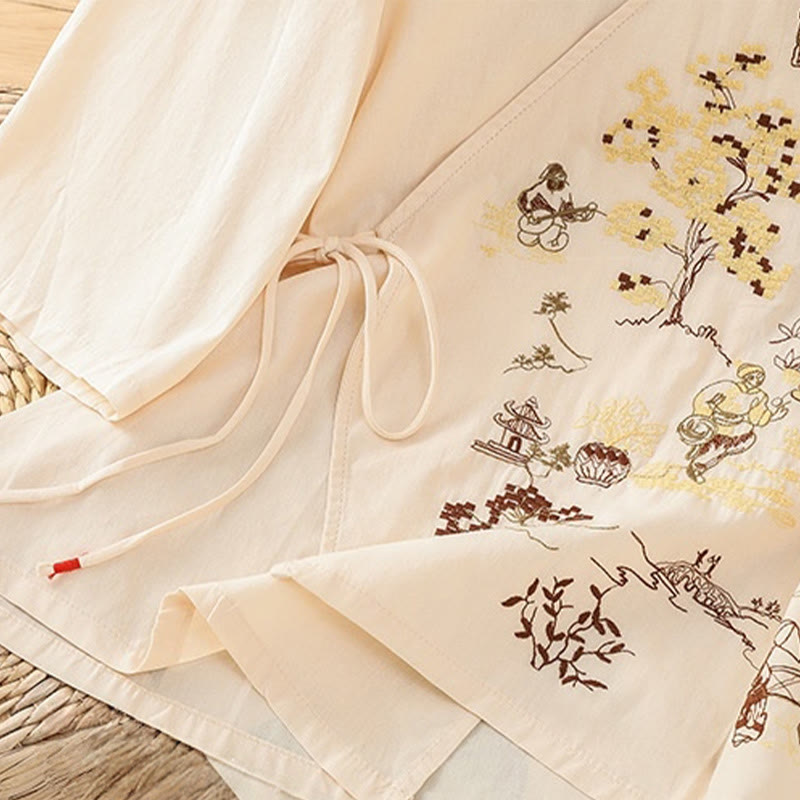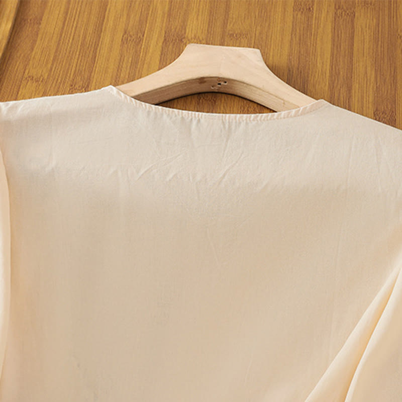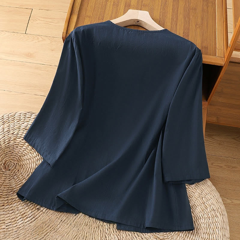 Buddha Stones Retro Embroidery Lace-Up Women's Three Quarter Sleeve Cotton Linen T-Shirt