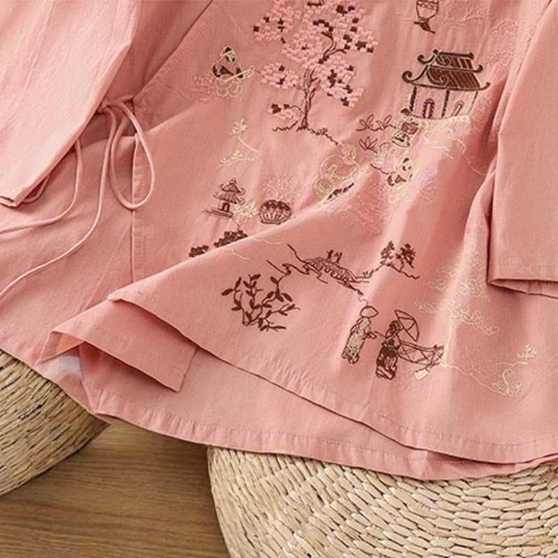 Buddha Stones Retro Embroidery Lace-Up Women's Three Quarter Sleeve Cotton Linen T-Shirt - Salmon - US12,UK/AU16,EU44 (2XL) - image 8