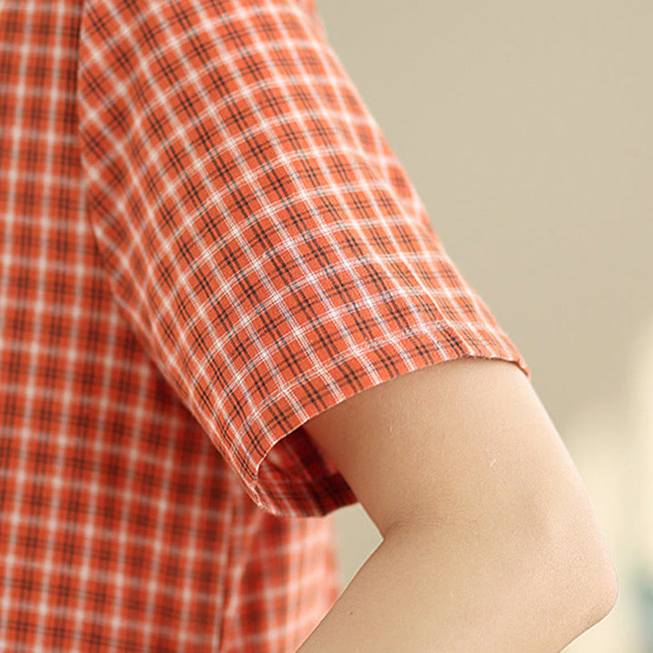Buddha Stones Retro Solid Color Plaid Pattern Crew Neck Short Sleeve Cotton Linen Midi Dress With Pockets