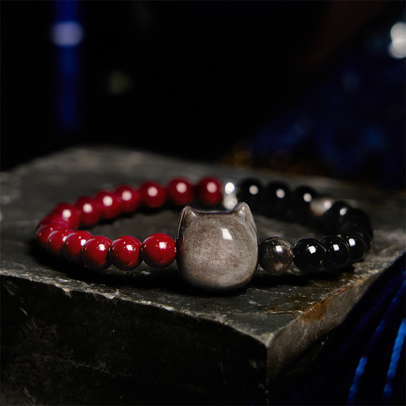 Buddha Stones Black Obsidian Cinnabar Silver Sheen Obsidian Cat Fulfilment Bracelet
